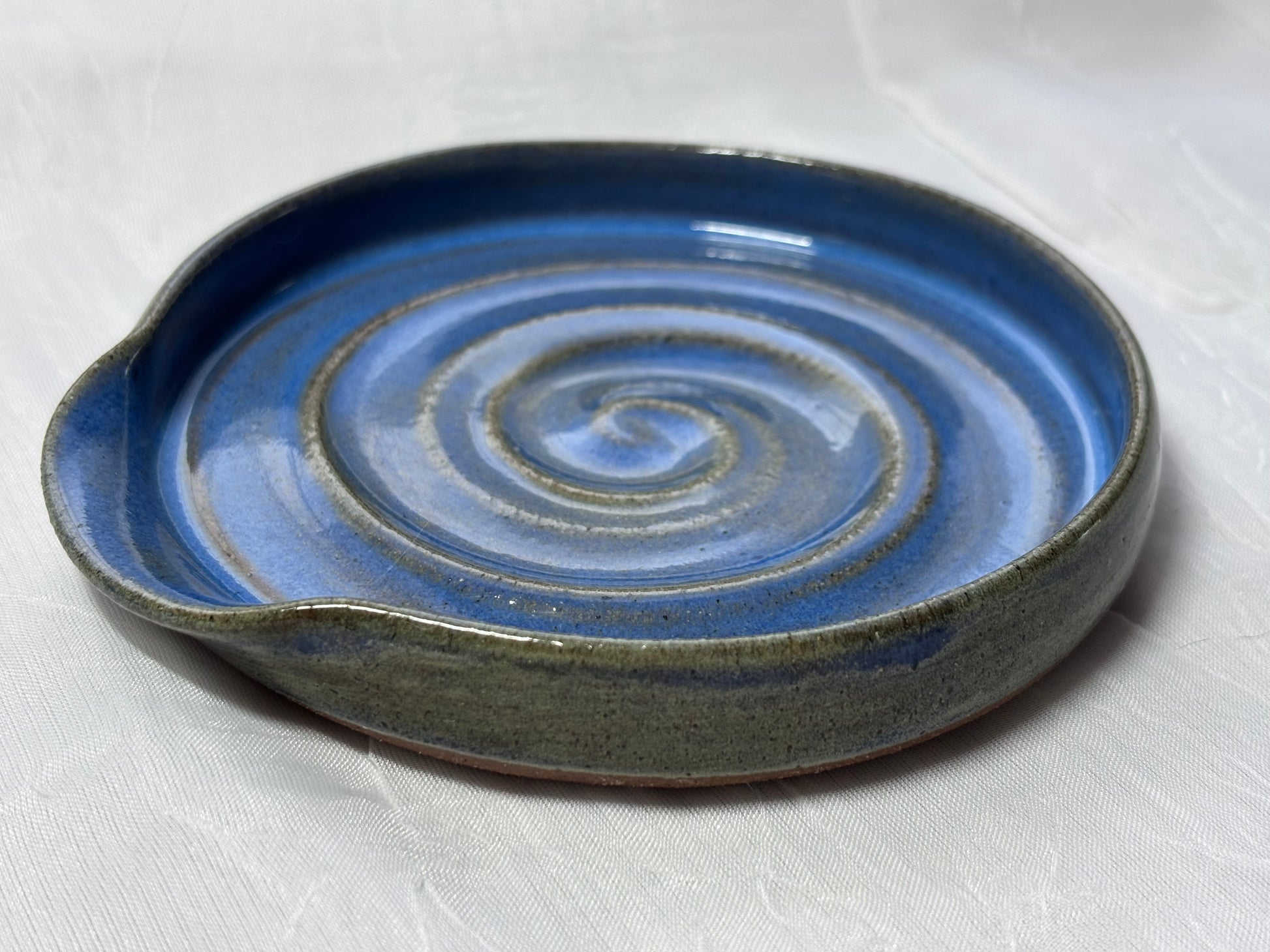 Blue swirl spoon rest, a durable and stylish stoneware product to add to your kitchen and help prevent messes.